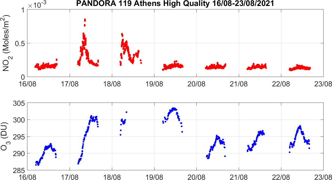 Weekly NO2 & O3 timeseries from 16/08/2021 to 23/08/2021