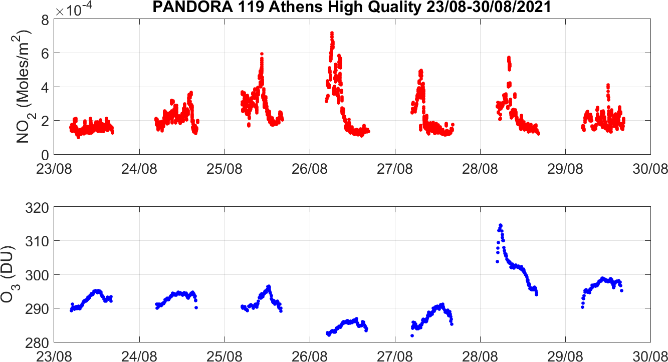 Weekly NO2 & O3 timeseries from 23/08/2021 to 30/08/2021