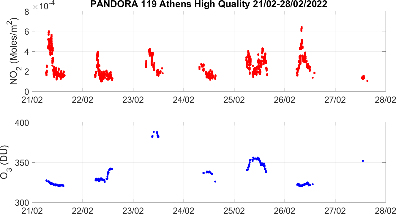 Weekly NO2 & O3 timeseries from 21/02/2022 to 28/02/2022