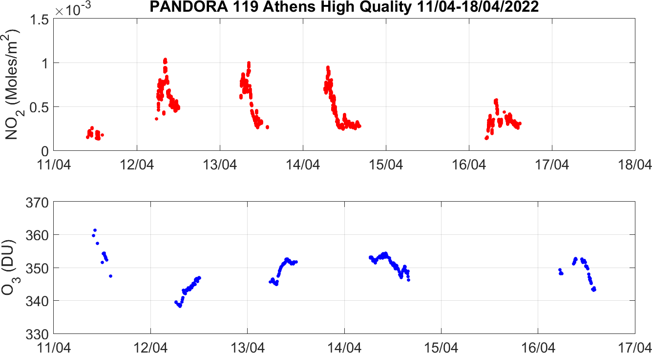 Weekly NO2 & O3 timeseries from 11/04/2022 to 18/04/2022