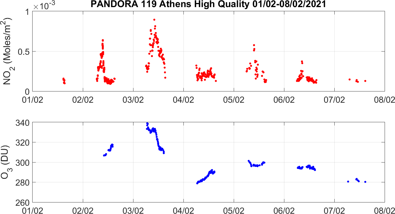 Weekly NO2 & O3 timeseries from 01/02/2021 to 08/02/2021