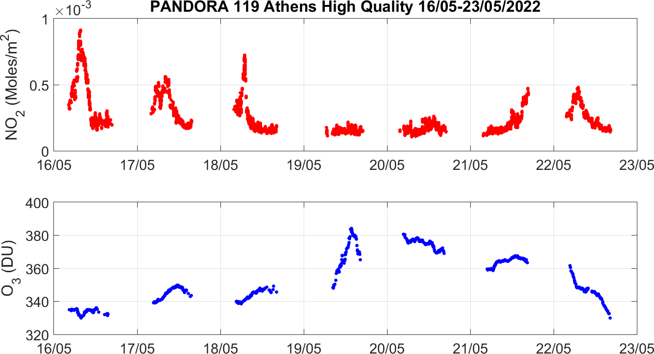 Weekly NO2 & O3 timeseries from 16/05/2022 to 23/05/2022