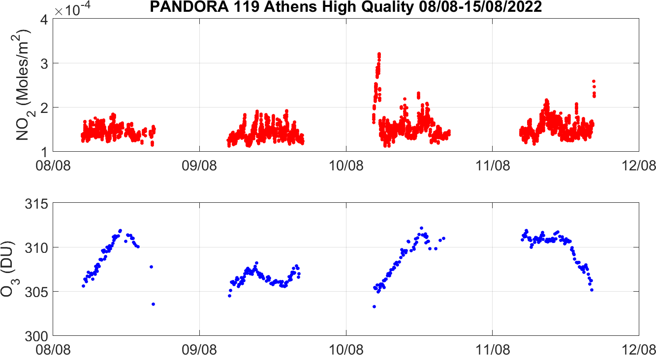 Weekly NO2 & O3 timeseries from 08/08/2022 to 15/08/2022