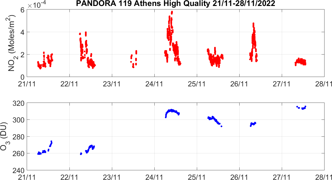 Weekly NO2 & O3 timeseries from 21/11/2022 to 28/11/2022