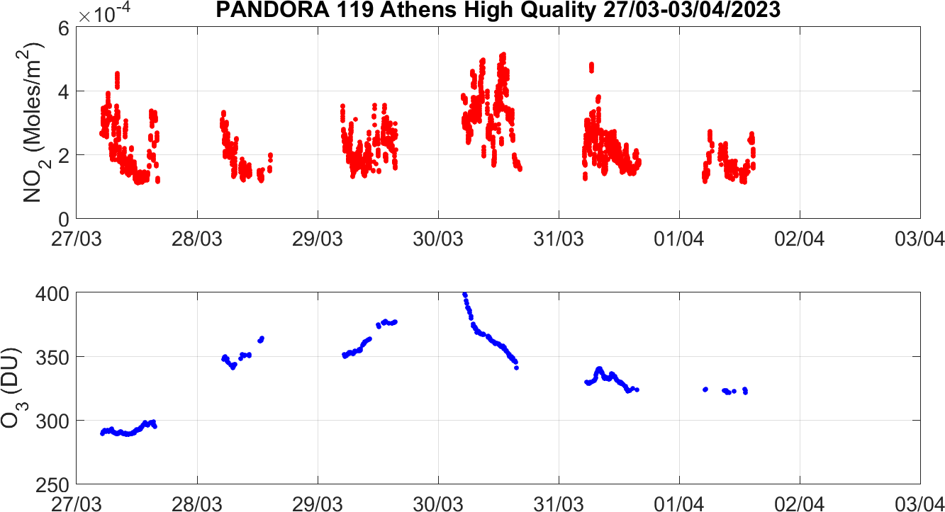 Weekly NO2 & O3 timeseries from 27/03/2023 to 03/04/2023