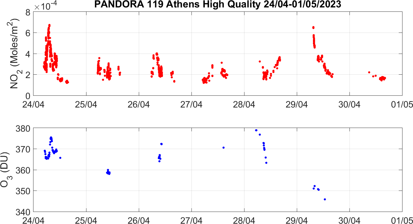Weekly NO2 & O3 timeseries from 24/04/2023 to 01/05/2023