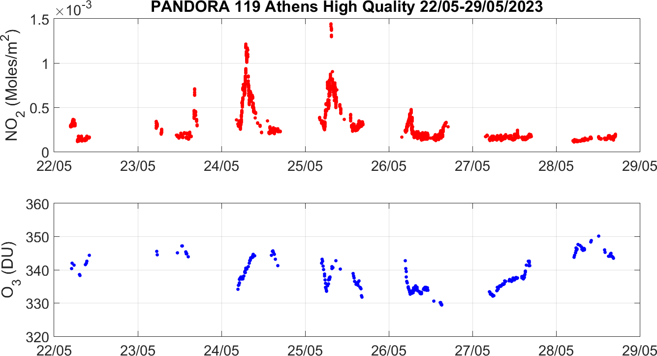 Weekly NO2 & O3 timeseries from 22/05/2023 to 29/05/2023