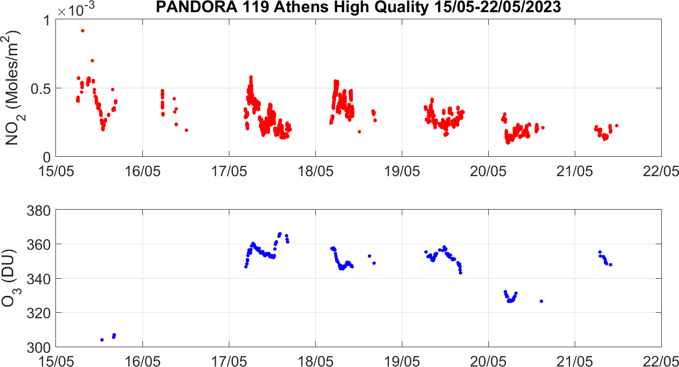 Weekly NO2 & O3 timeseries from 15/05/2023 to 22/05/2023