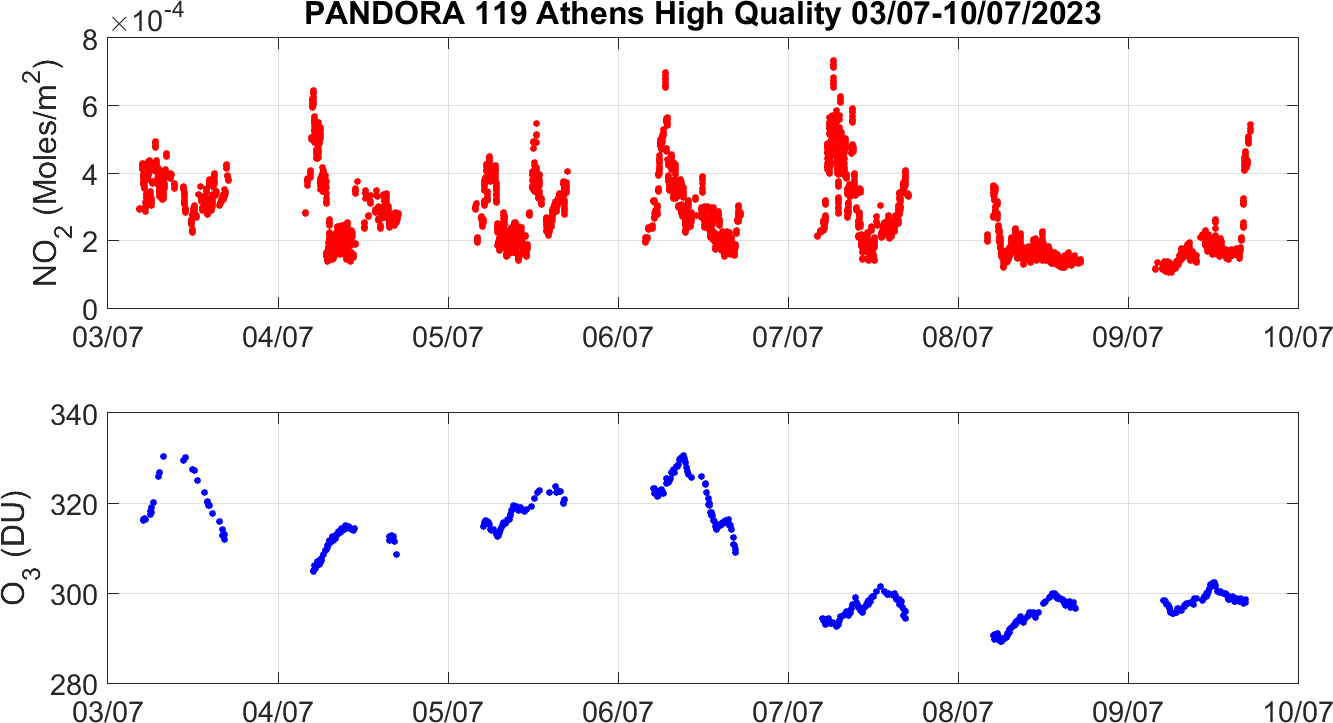 Weekly NO2 & O3 timeseries from 03/07/2023 to 10/07/2023