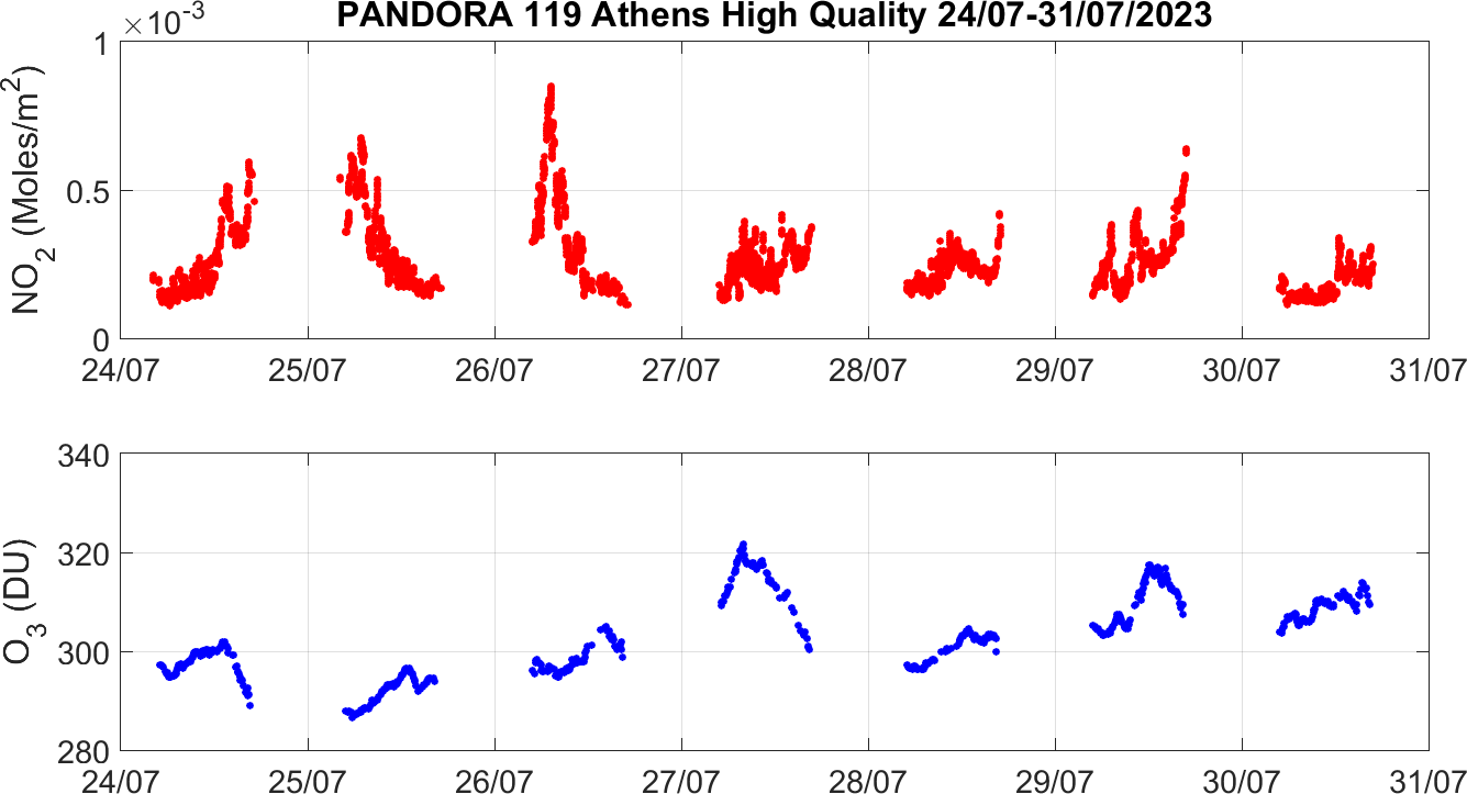 Weekly NO2 & O3 timeseries from 24/07/2023 to 31/07/2023
