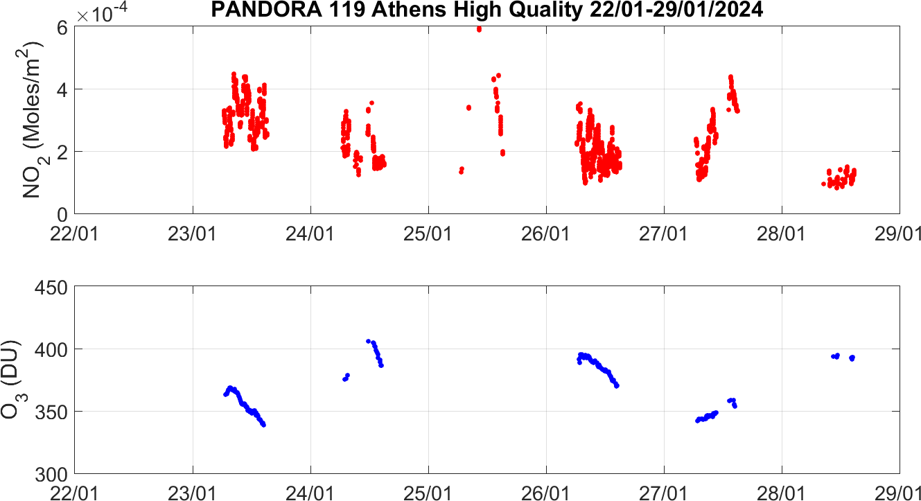 Weekly NO2 & O3 timeseries from 22/01/2024 to 29/01/2024