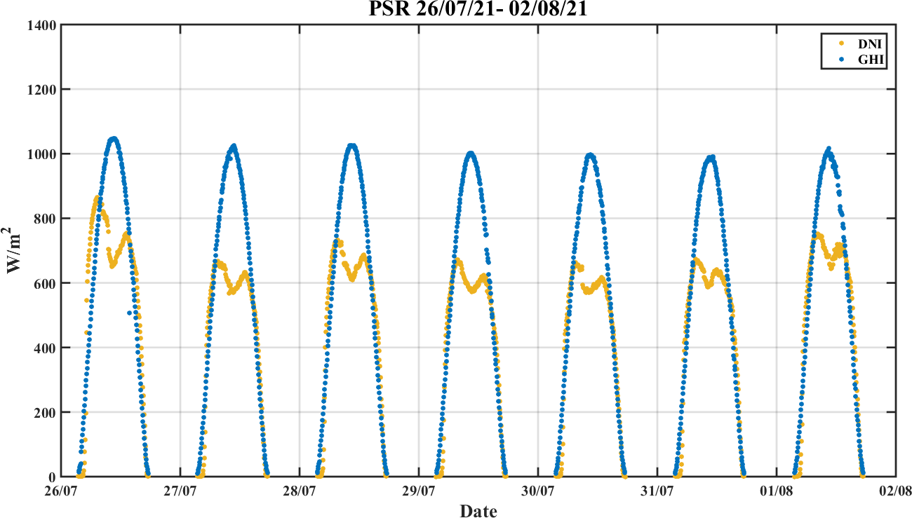 Weekly DNI & GHI timeseries from 26/07/2021 to 02/08/2021