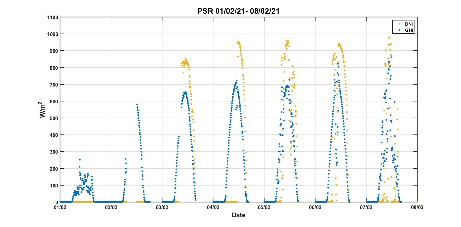 Weekly DNI & GHI timeseries from 01/02/2021 to 08/02/2021