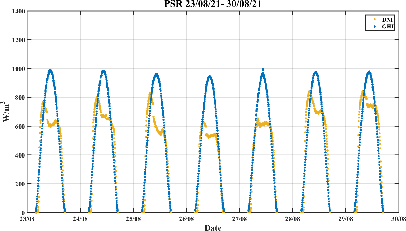 Weekly DNI & GHI timeseries from 23/08/2021 to 30/08/2021
