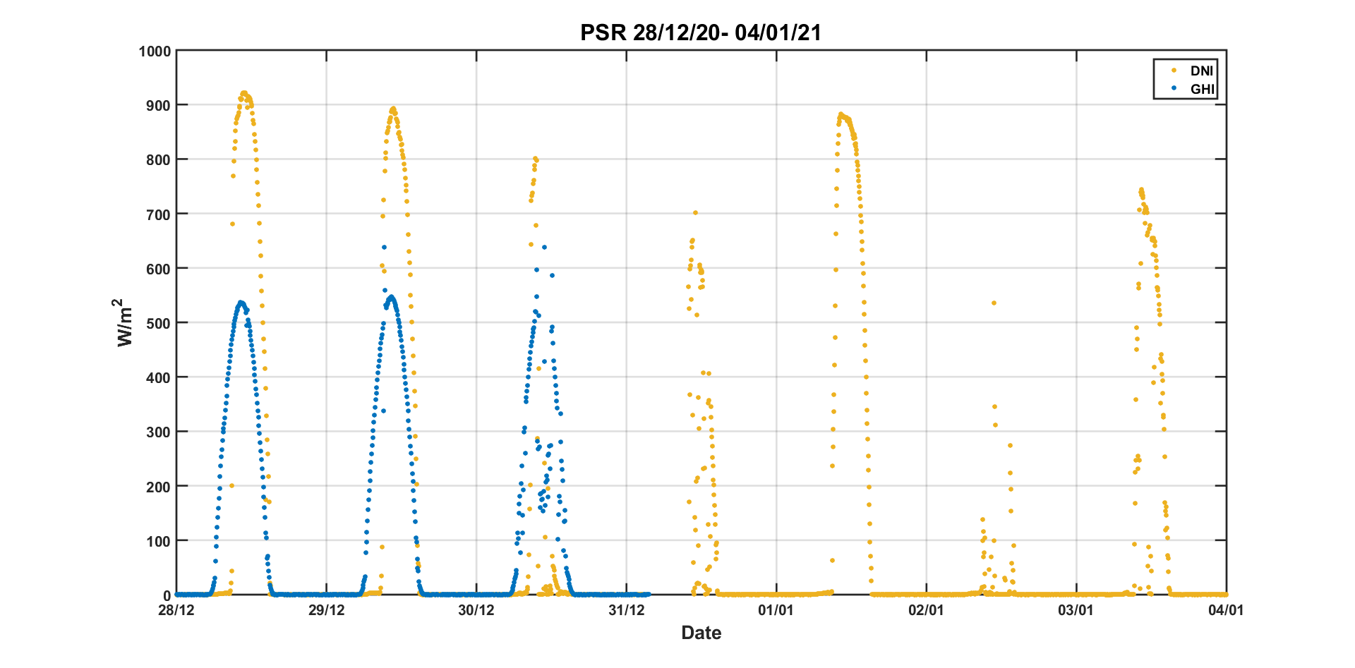 Weekly DNI & GHI timeseries from 28/12/2020 to 04/01/2021