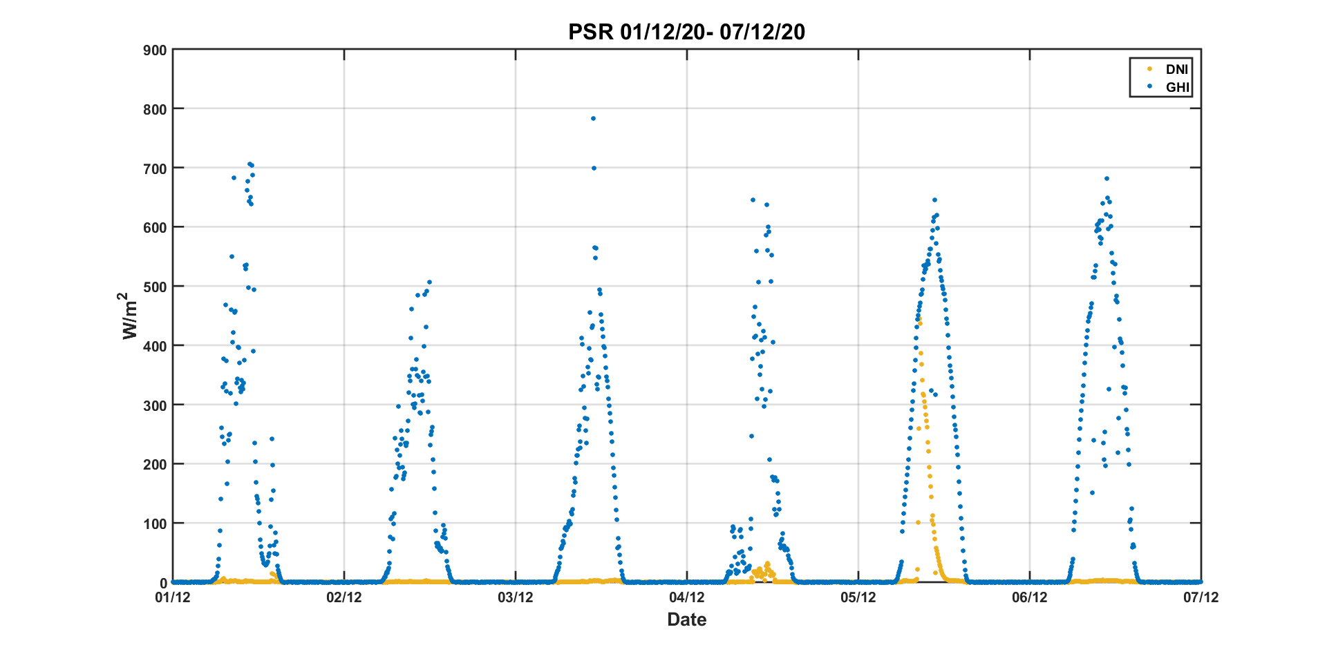 Weekly DNI & GHI timeseries from 01/12/2020 to 07/12/2020