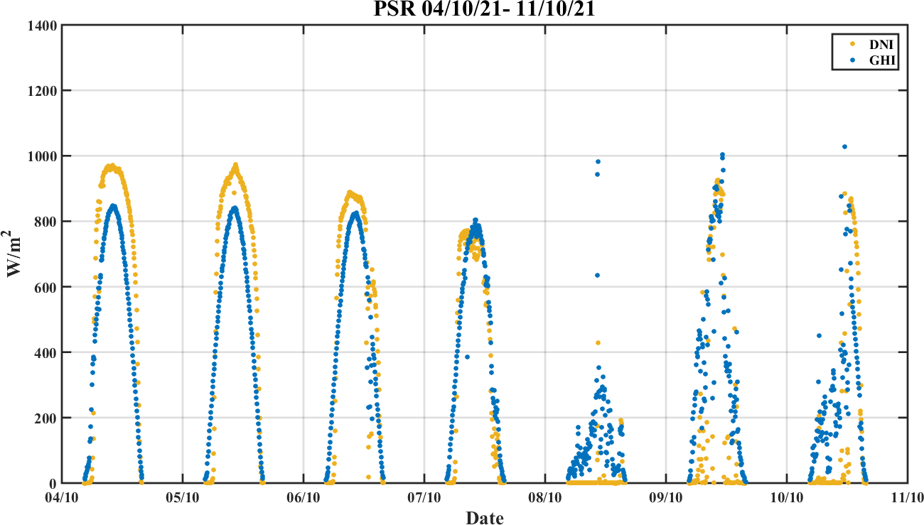 Weekly DNI & GHI timeseries from 04/10/2021 to 11/10/2021