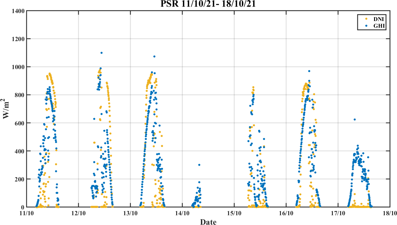 Weekly DNI & GHI timeseries from 11/10/2021 to 18/10/2021