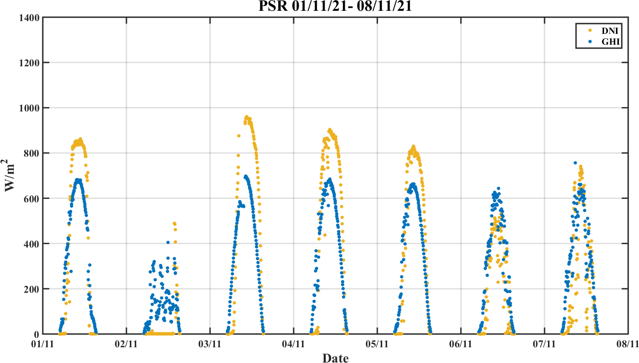 Weekly DNI & GHI timeseries from 01/11/2021 to 08/11/2021