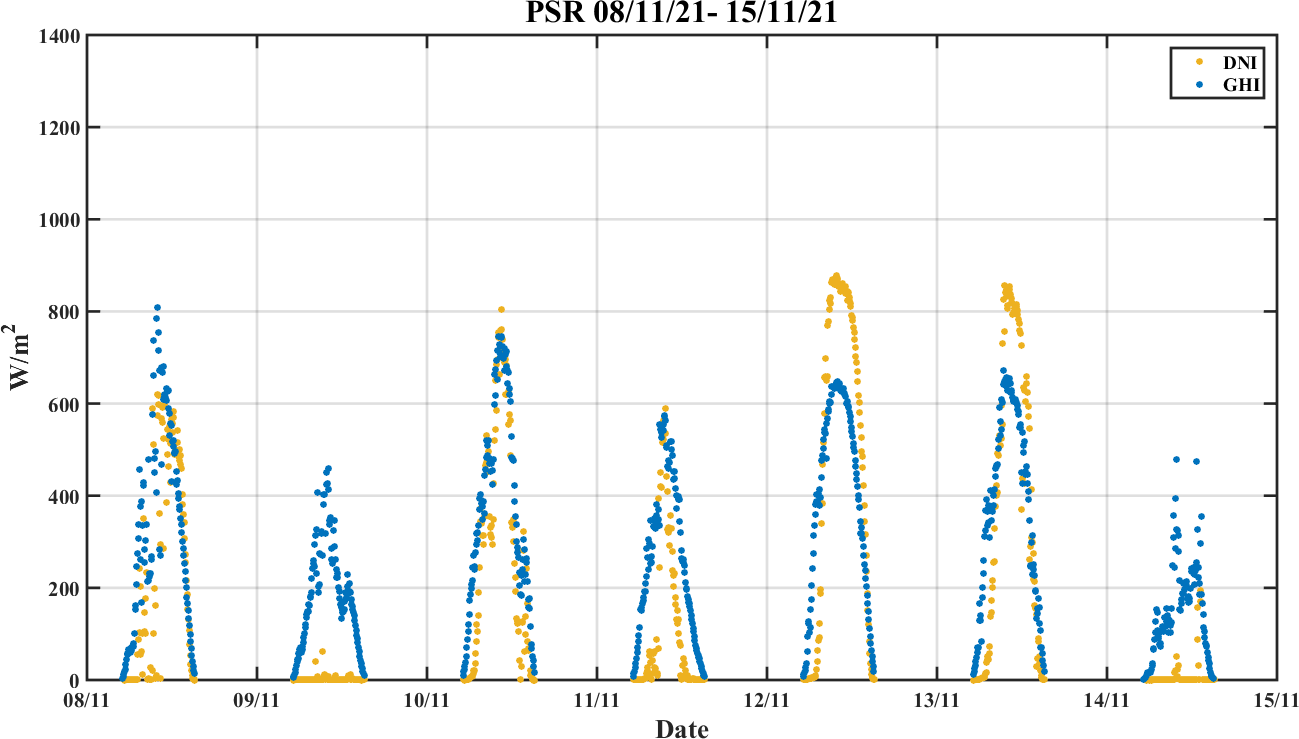 Weekly DNI & GHI timeseries from 08/11/2021 to 15/11/2021