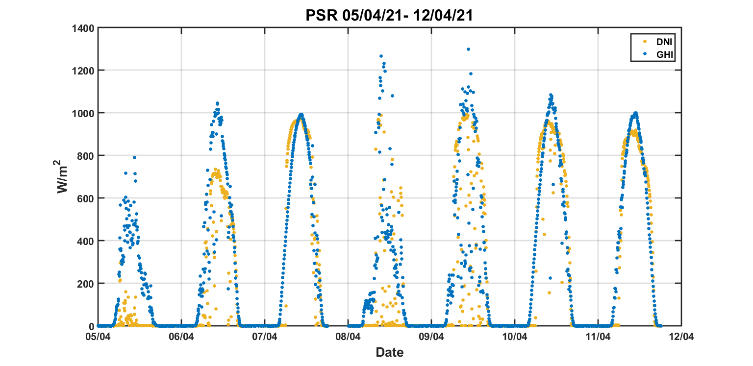 Weekly DNI & GHI timeseries from 05/04/2021 to 12/04/2021