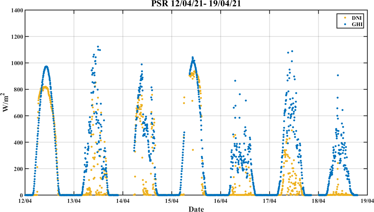 Weekly DNI & GHI timeseries from 12/04/2021 to 19/04/2021