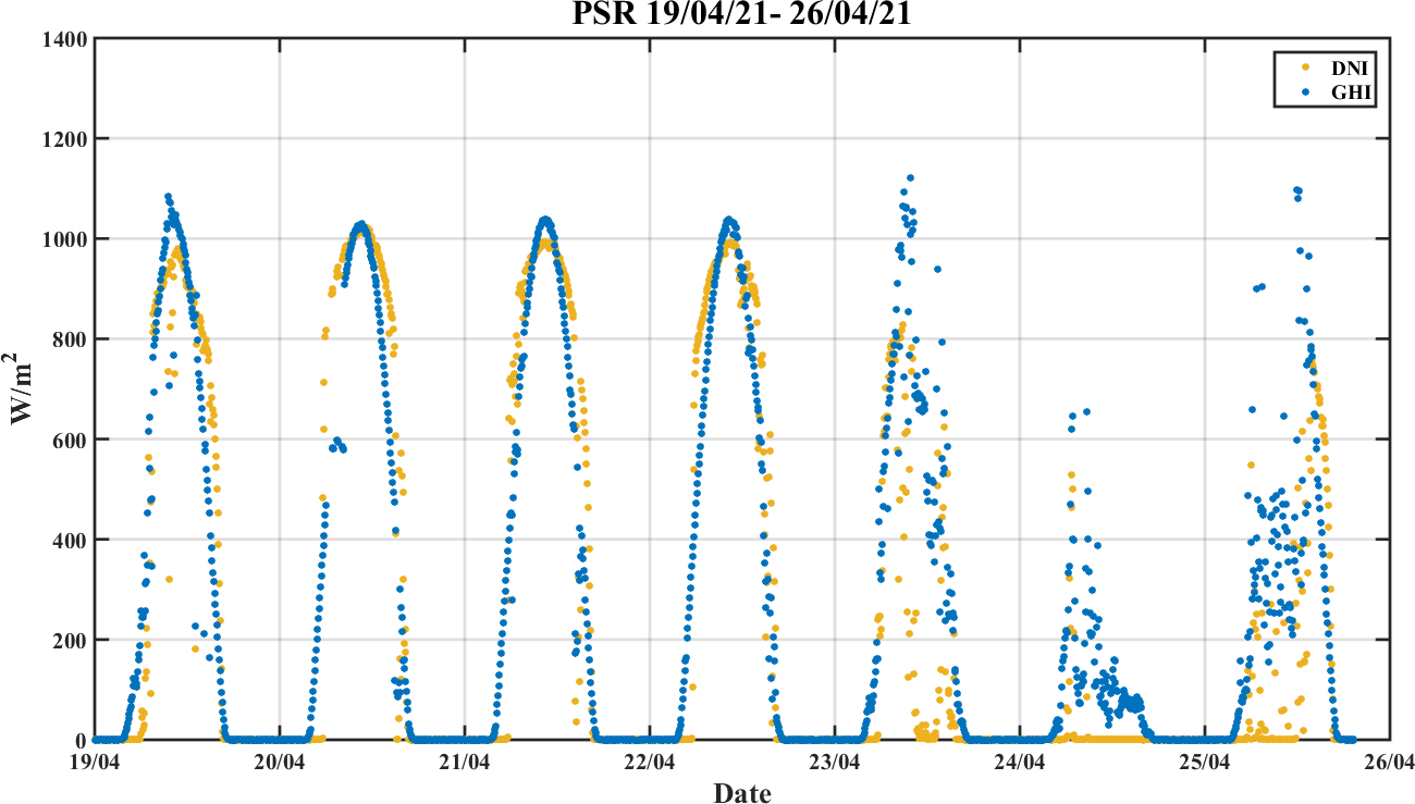 Weekly DNI & GHI timeseries from 19/04/2021 to 26/04/2021