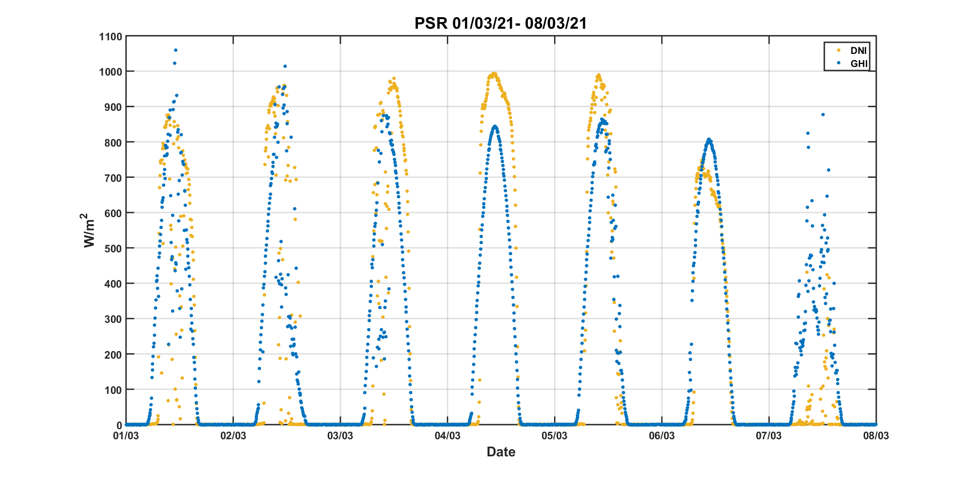 Weekly DNI & GHI timeseries from 01/03/2021 to 08/03/2021