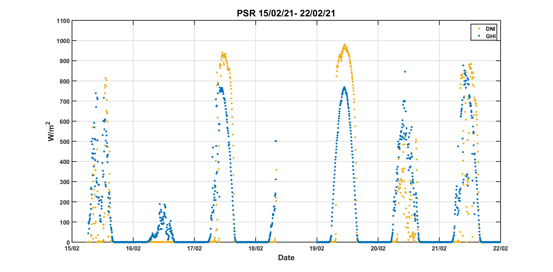 Weekly DNI & GHI timeseries from 15/02/2021 to 22/02/2021